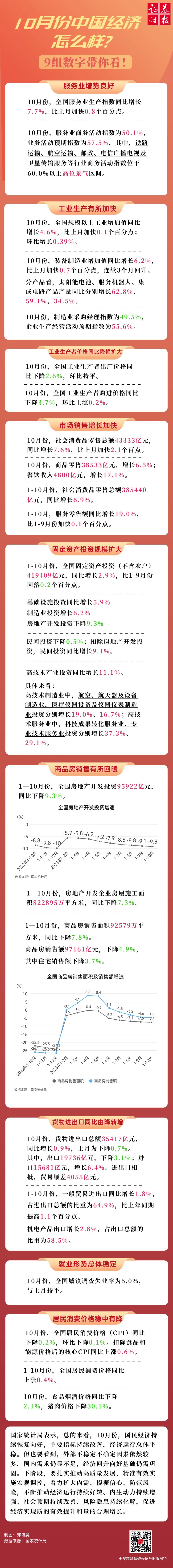 数据显示,10月份,全国规模以上工业增加值同比增长4.6%,比上月加快0.1个百分点。全国服务业生产指数同比增长7.7%,比上月加快0.8个百分点。社会消费品零售总额同比增长7.6%,比上月加快2.1个百分点。