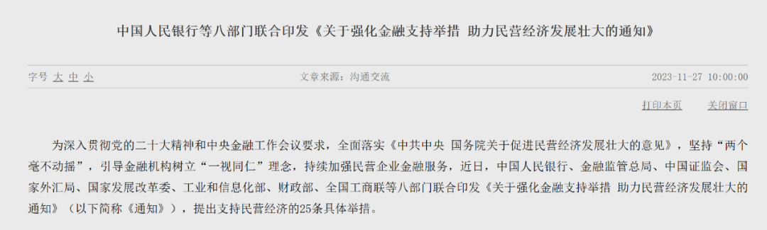 人民银行网站11月27日消息,近日,中国人民银行、金融监管总局、中国证监会、国家外汇局、国家发展改革委、工业和信息化部、财政部、全国工商联等八部门联合印发《关于强化金融支持举措 助力民营经济发展壮大的通知》,提出支持民营经济的25条具体举措。