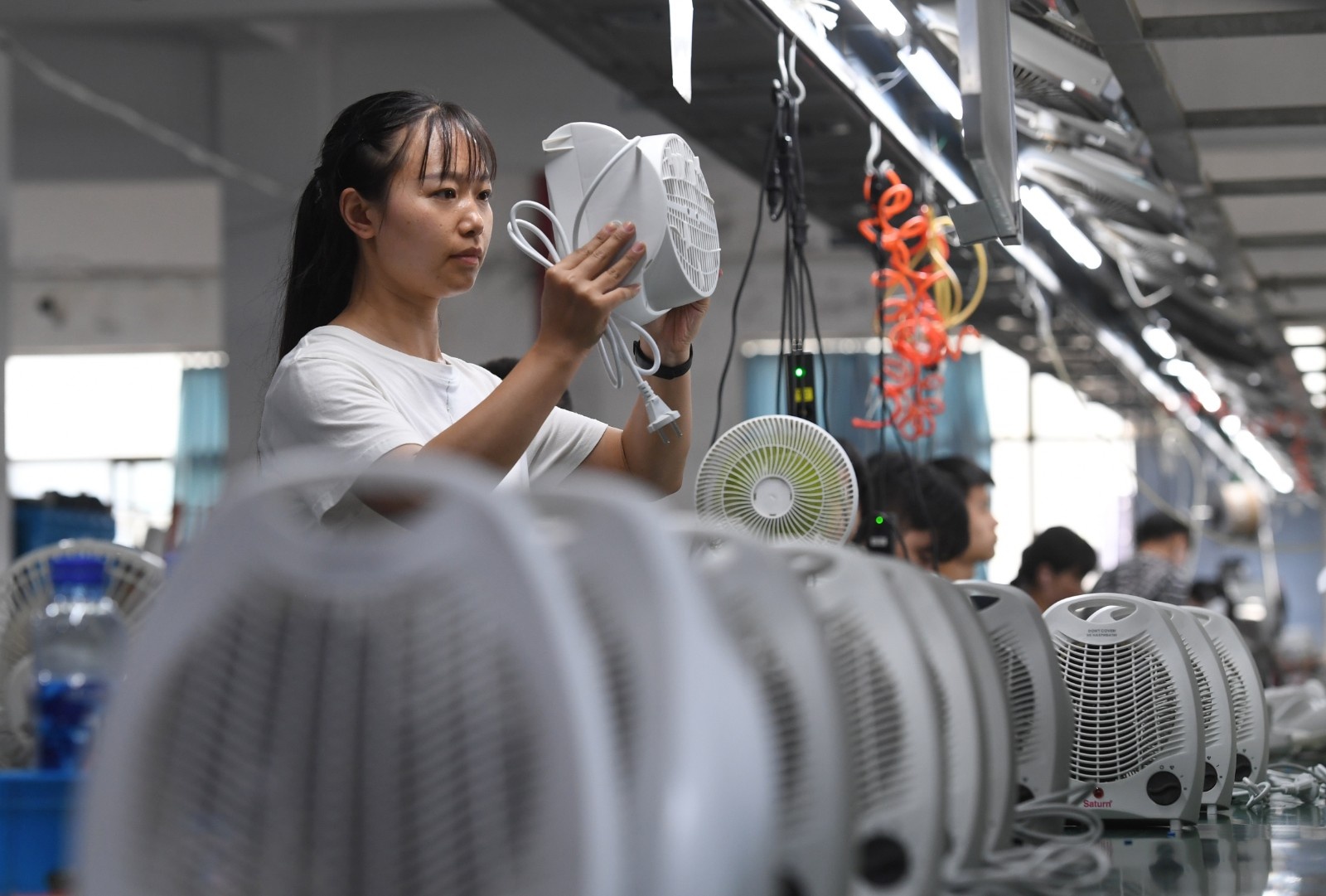 工人在检测即将下线的暖风机。(图片由CNSPHOTO提供)