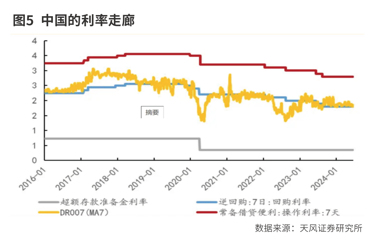 利率走廊过宽会导致市场资金利率与政策利率偏离太大、太久会模糊政策信号,导致政策利率的信号作用变差。因此,中国的利率走廊宽度存在一定的优化空间。天风证券(601162)认为,后续央行可能通过提高下限,压低上限的方式,收窄利率走廊宽度,但这与央行降息不能混为一谈。