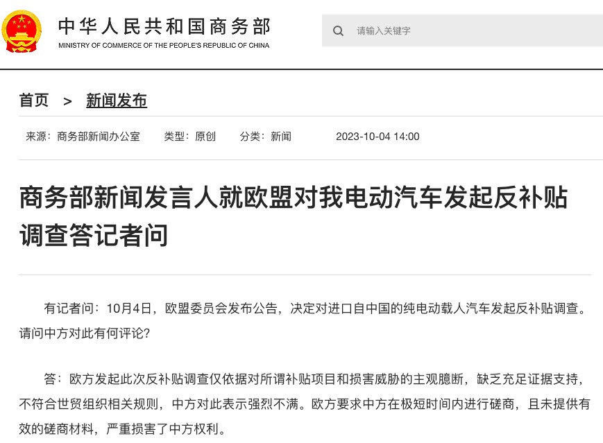 新华社报道,10月4日,商务部网站消息,商务部发言人就欧盟对我电动汽车发起反补贴调查表示,欧方发起此次反补贴调查仅依据对所谓补贴项目和损害威胁的主观臆断,缺乏充足证据支持,不符合世贸组织相关规则,中方对此表示强烈不满。欧方要求中方在极短时间内进行磋商,且未提供有效的磋商材料,严重损害了中方权利。