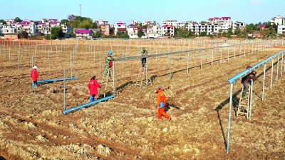 近年来,江西省吉安市永丰县着力打造粤港澳大湾区蔬菜专供基地,发展绿色无公害蔬菜富民产业,推动产业增效、菜农增收,巩固拓展脱贫攻坚成果,促进乡村经济振兴。图为吉安市永丰县坑田镇塘下村蔬菜产业园,农民在扩建蔬菜温室大棚。 CNSPHOTO提供 |